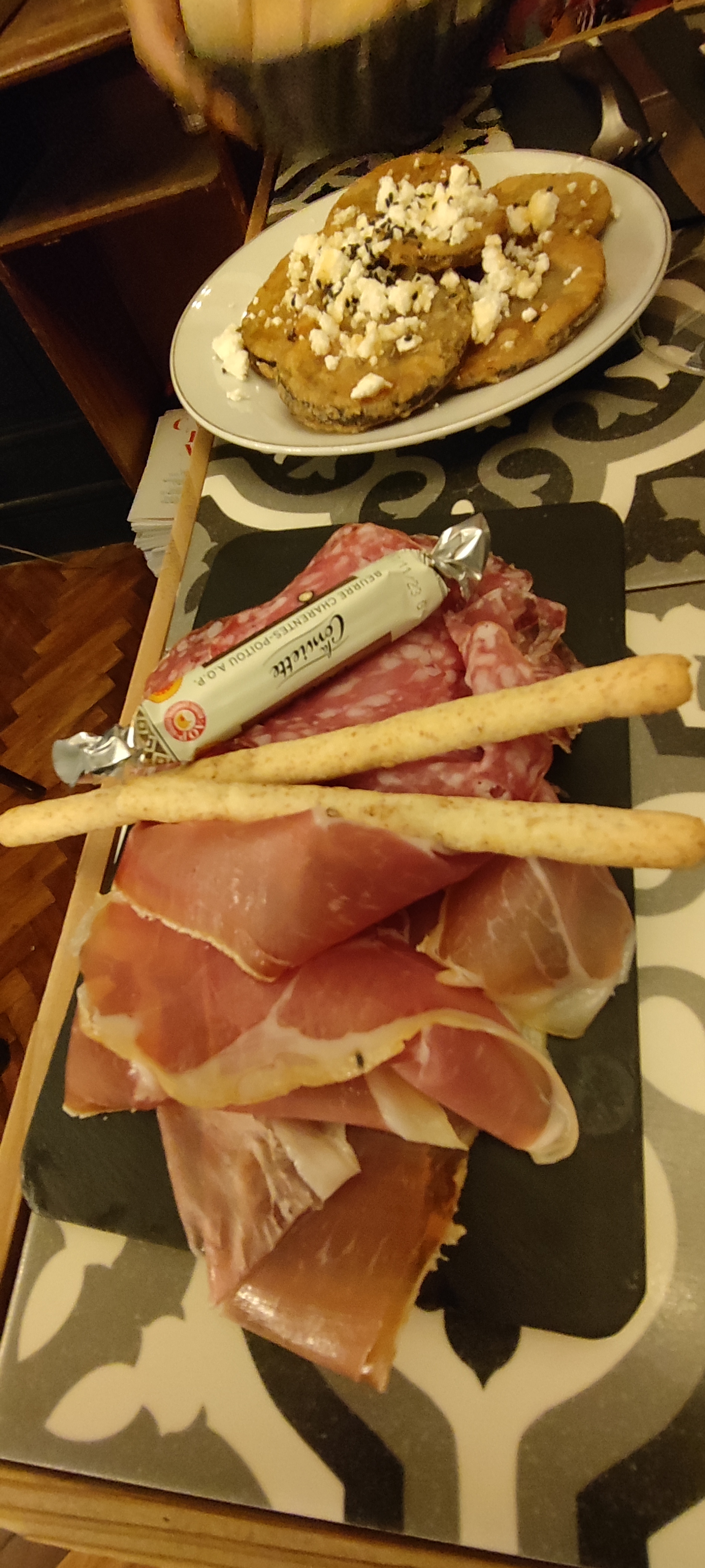 Décor qui nous transporte loin de Marseille, dans une Espagne à la fois historique et fantasmée. Mention pour le coin fauteuil et bibliothèque ! Assortiment de tapas de haut vol, les jambons sont au top, les fromages aussi.
