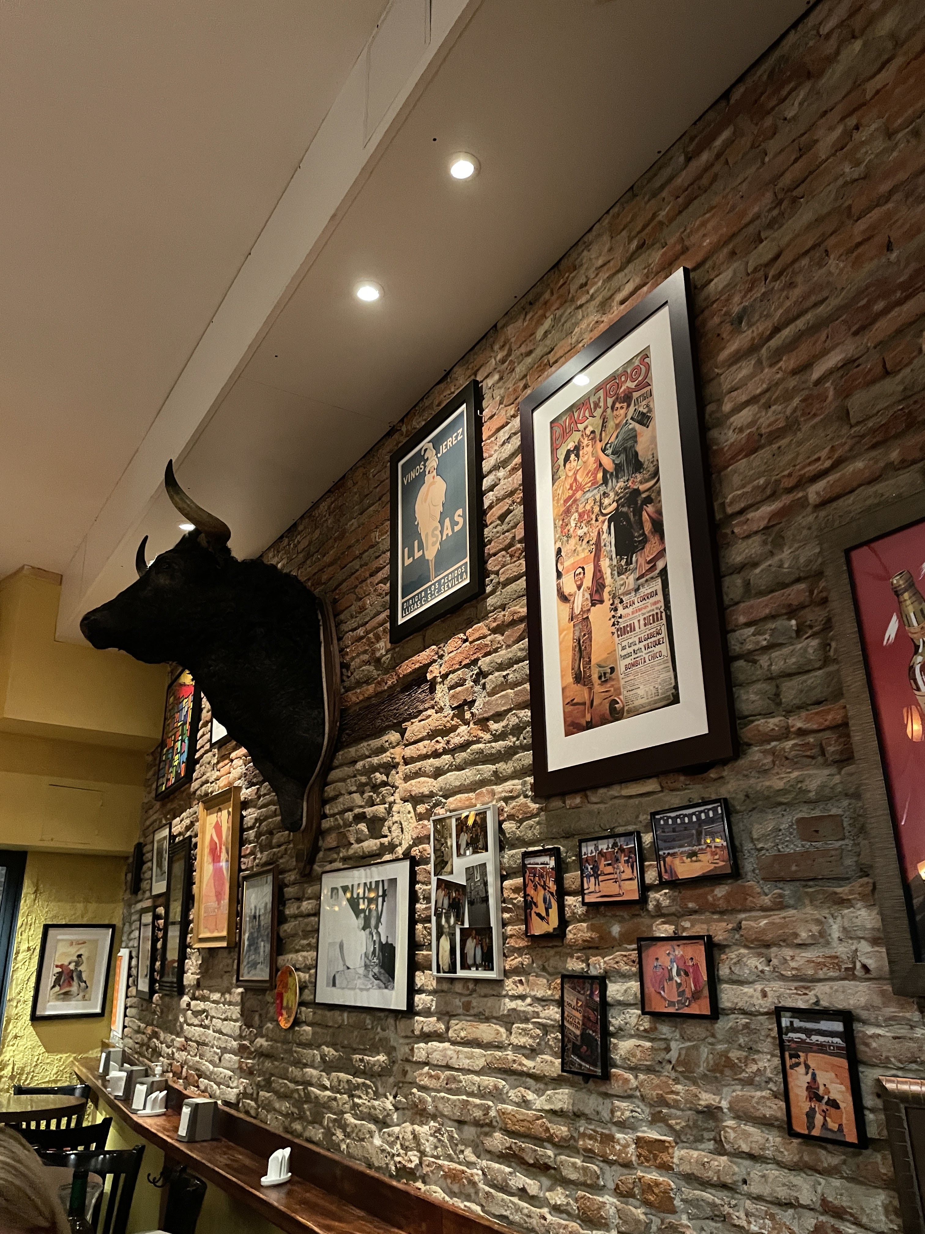 Okay : je reconnais que le look de ce bar à tapas est dans la tradition iberique. Mur de brique, liste de tapas « dans la tradition ». Petites tables. La qualité des tapas est quelconque : le queso manchego était assez fade, les encornets sans saveur. Les gambas à l’ail étaient réussies en revanche. Notre serveur était sympathique, mais étonnamment placide. Enfin les tapas manquent d’originalité/savoir-faire et la concurrence très proche fait bien mieux ... la terrasse est probablement trop etroite et cela sent le graillon de maniere permanente... dommage !